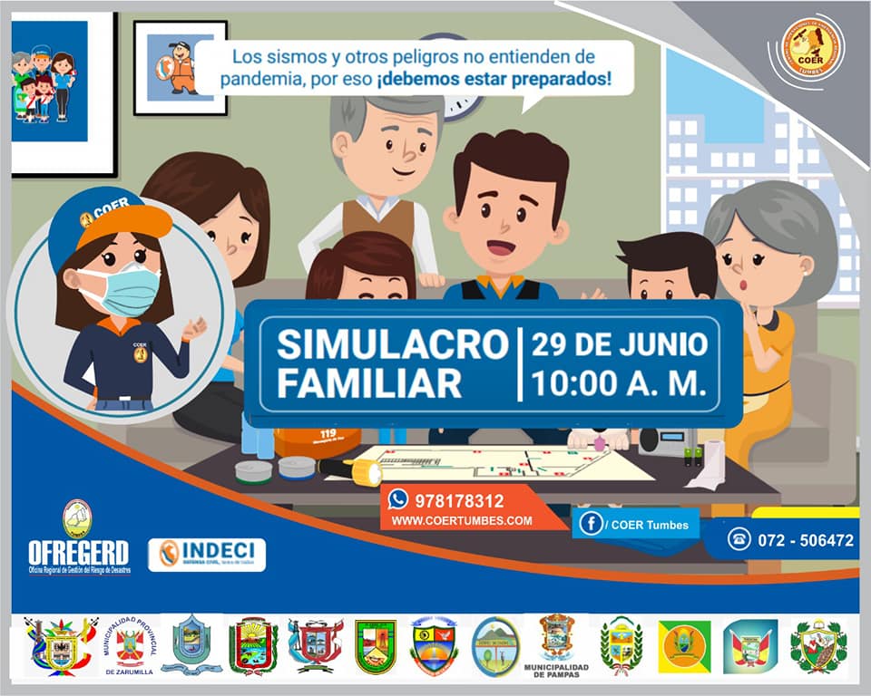 La Municipalidad Provincial de Contralmirante Villar liderada por el Méd. Jesús Alberto Luna Ordinola, te informa que el Gobierno central esta llevando a cabo este martes 29 de junio a las 10:00 de la mañana el primer Simulacro Familiar del año realizando las siguientes acciones: